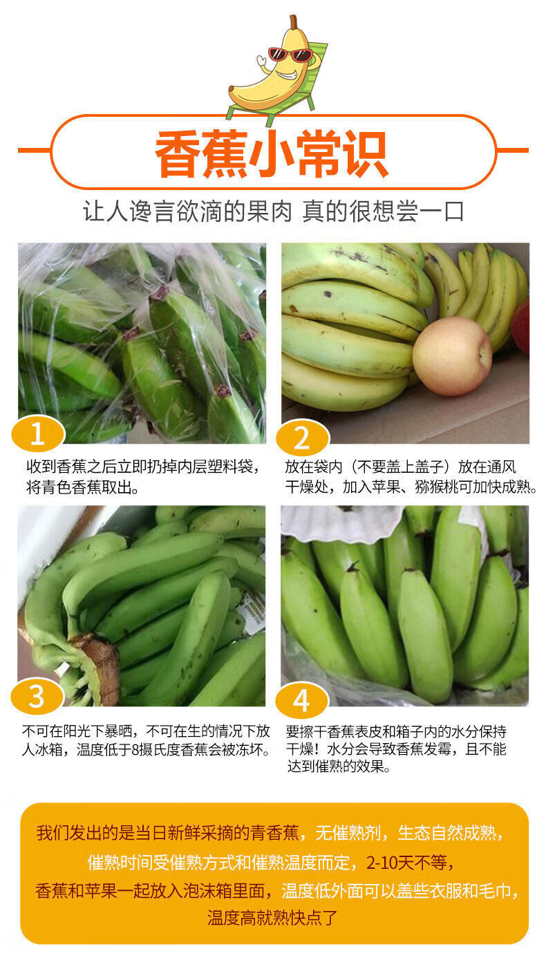 《温馨提示》:为了保证顾客收到都是新鲜的香蕉,我们都是采收7-8分熟的香蕉发出,收到后按照我们的催熟方法进行催熟后食用,介意勿拍!!!
